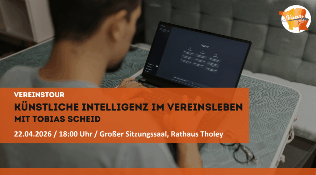 Künstliche Intelligenz im Vereinsleben ist kein Zukunftsthema mehr – es ist jetzt! Am 22. April 2026 macht die Vereinstour Saarland Station im Großen Sitzungssaal des Rathauses Tholey und zeigt Dir praxisnah, wie moderne KI-Tools wie ChatGPT Deinen Vereinsalltag vereinfachen können. Von der Vereinskommunikation bis zur Veranstaltungsplanung – entdecke die Möglichkeiten, die Dir künstliche Intelligenz heute schon bietet!